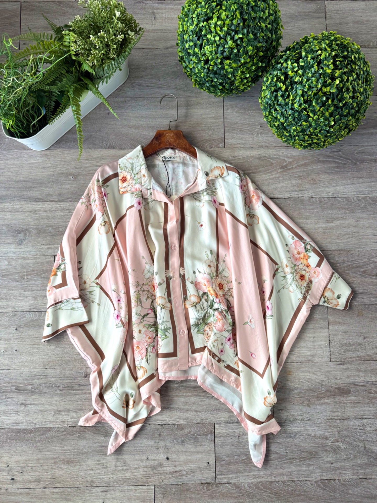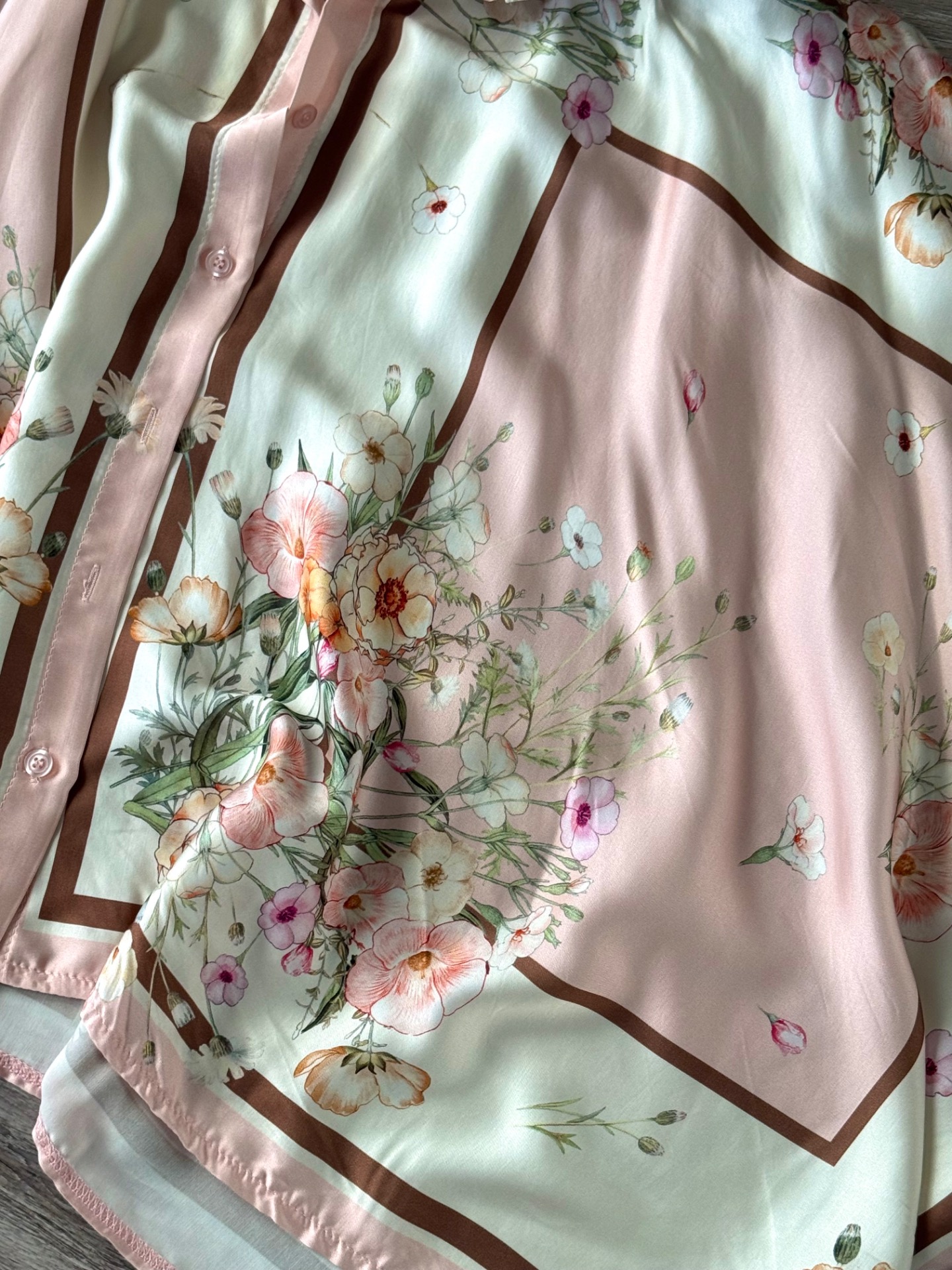 Camicia oversize foular con fantasia rosa e marrone, bottoni e taglio trapezio100% made in italy