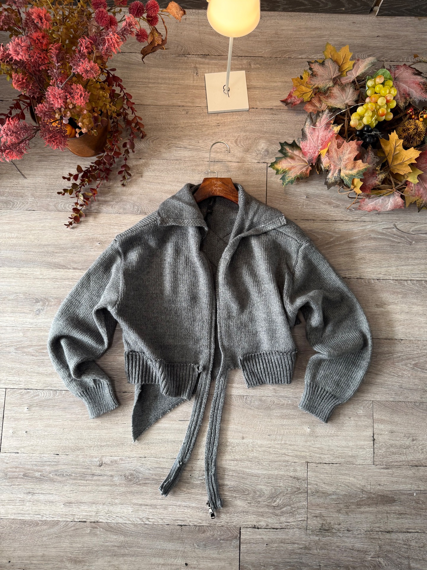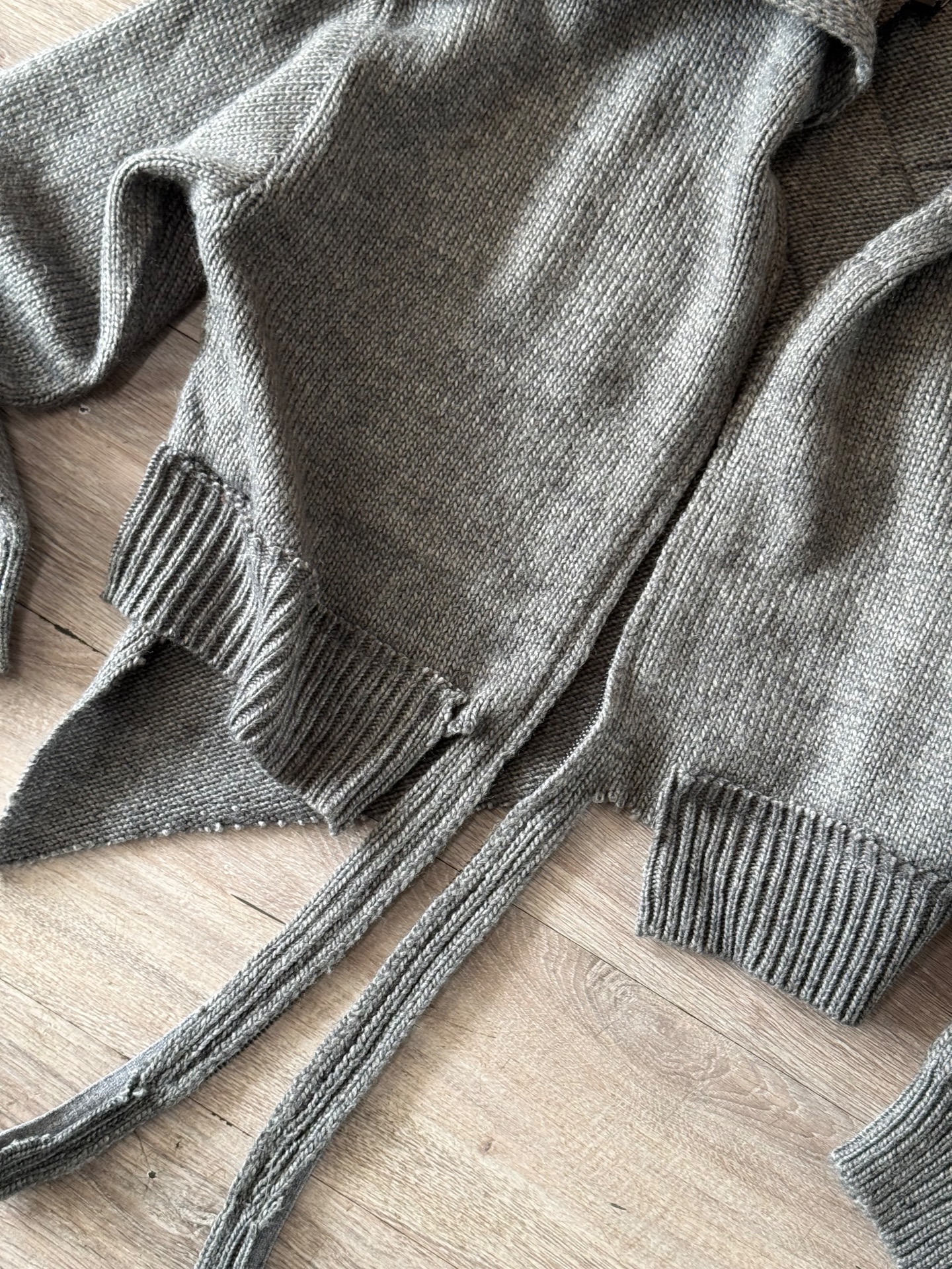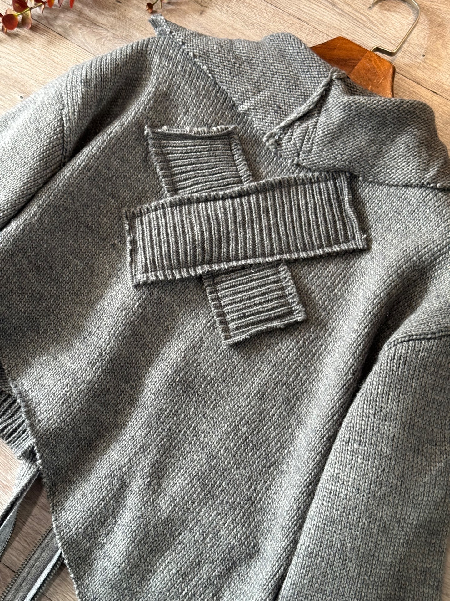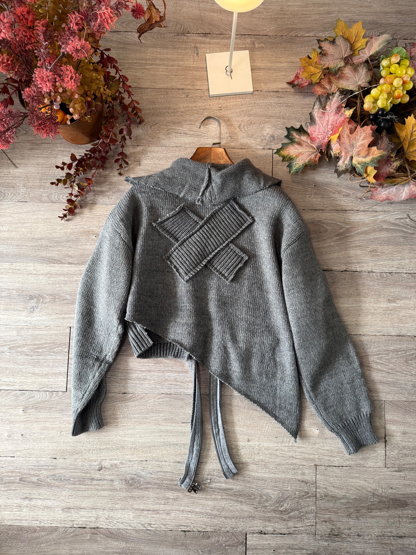 Felpa in maglia con zip, taglio cropped, decostruito e asimettrico, fatta a mano