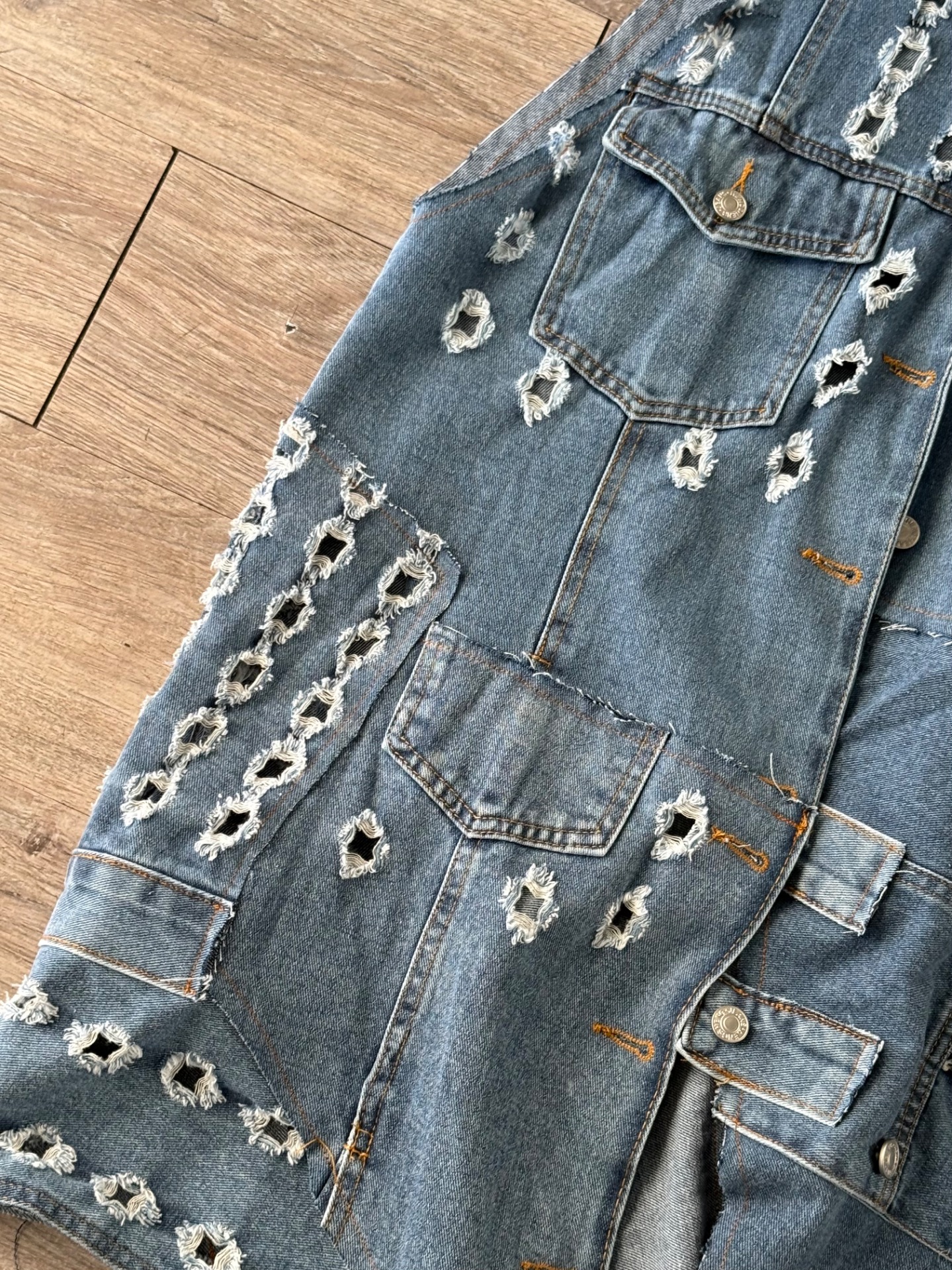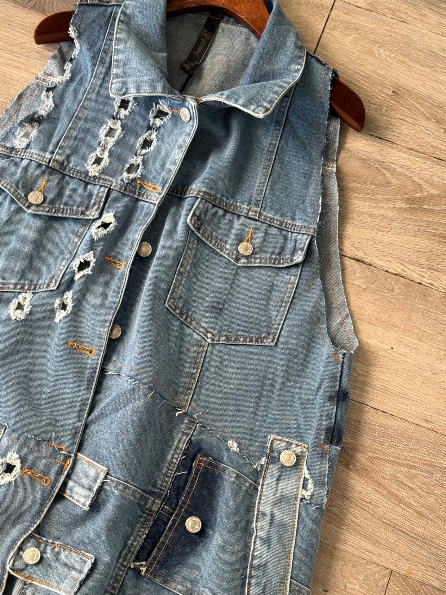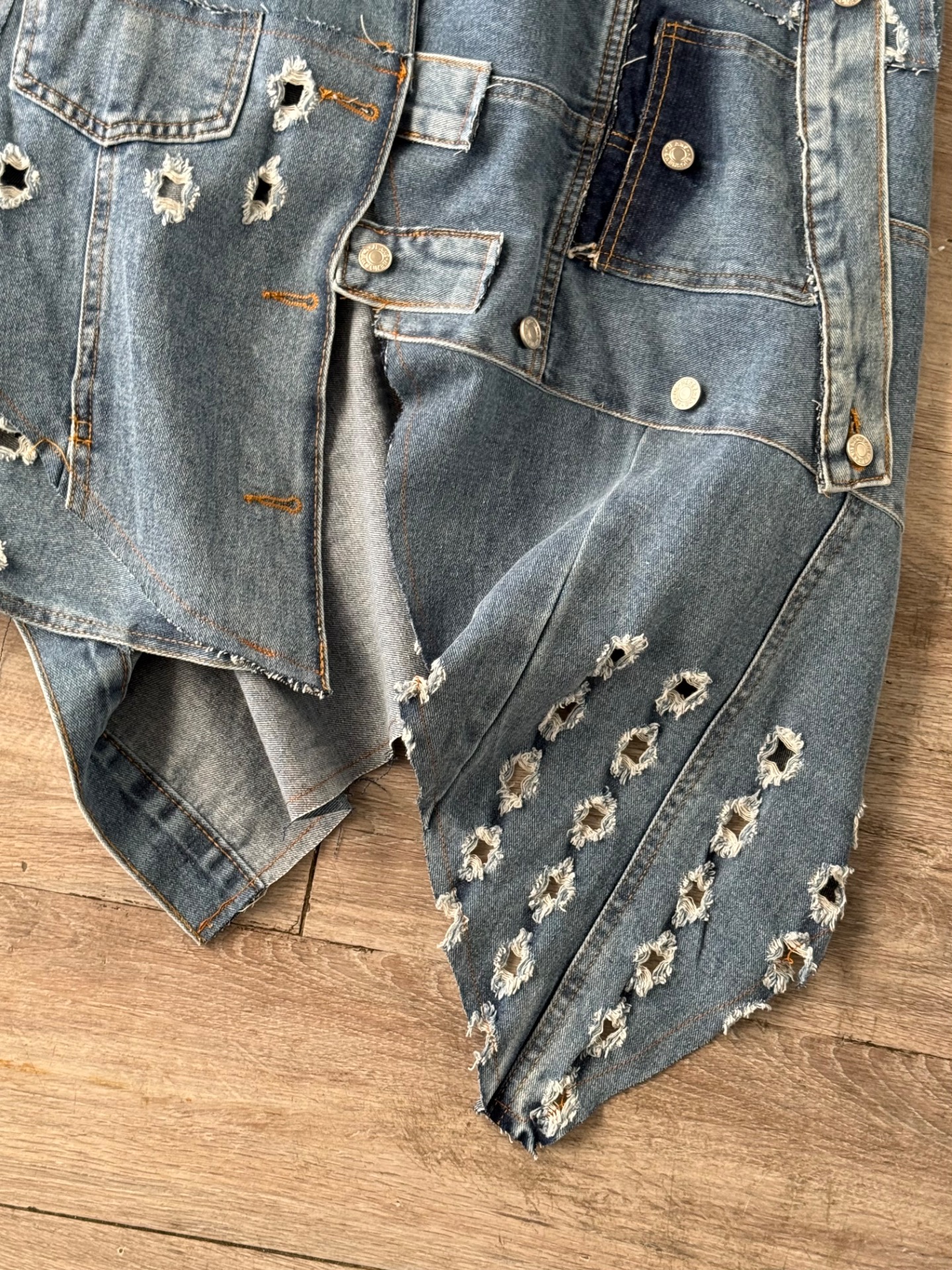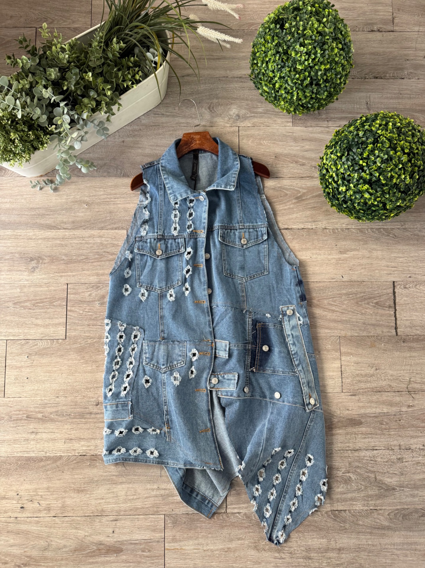 Gilet in denim con bottoni a strappi, taglio decostruito, lungo