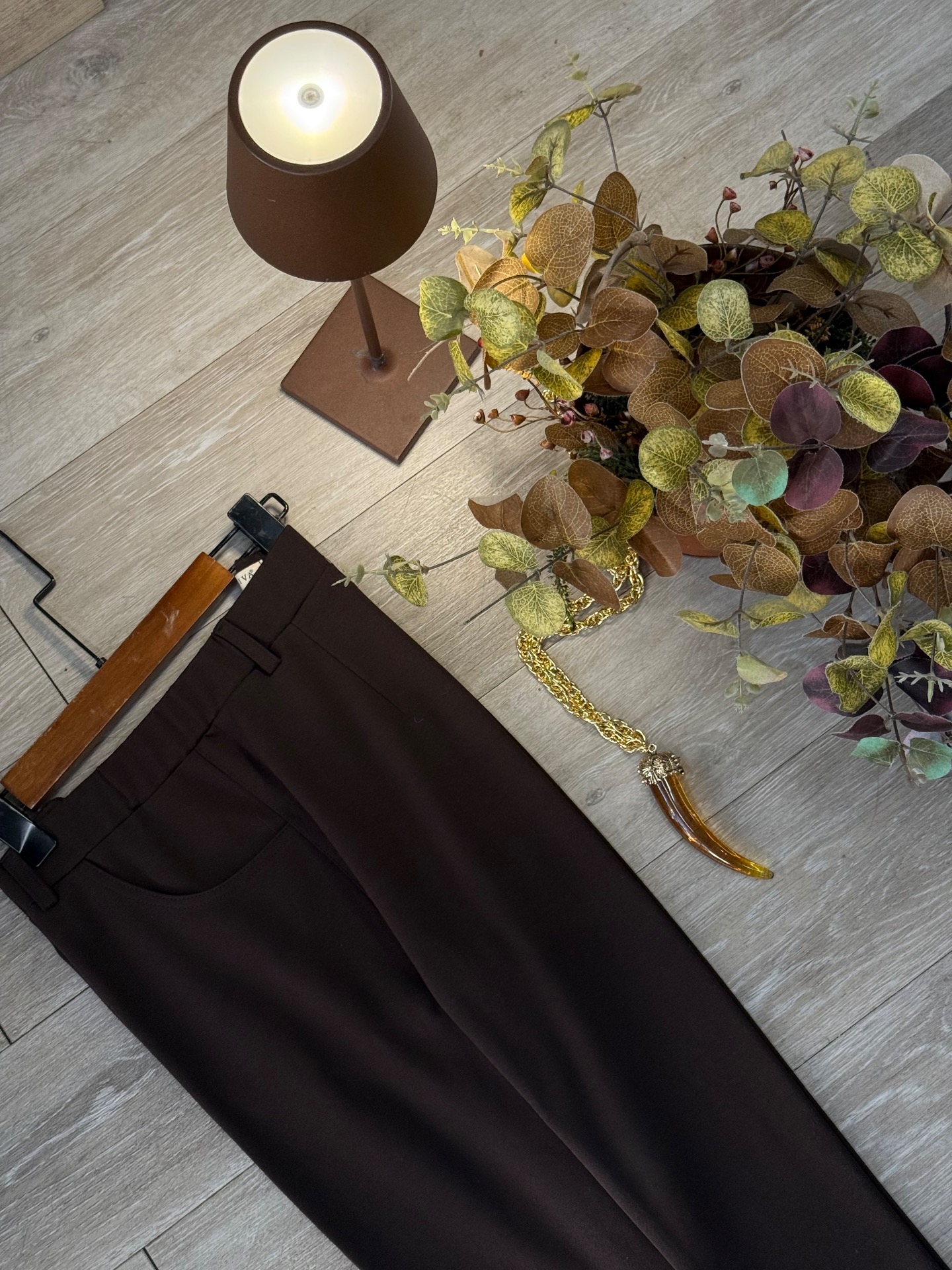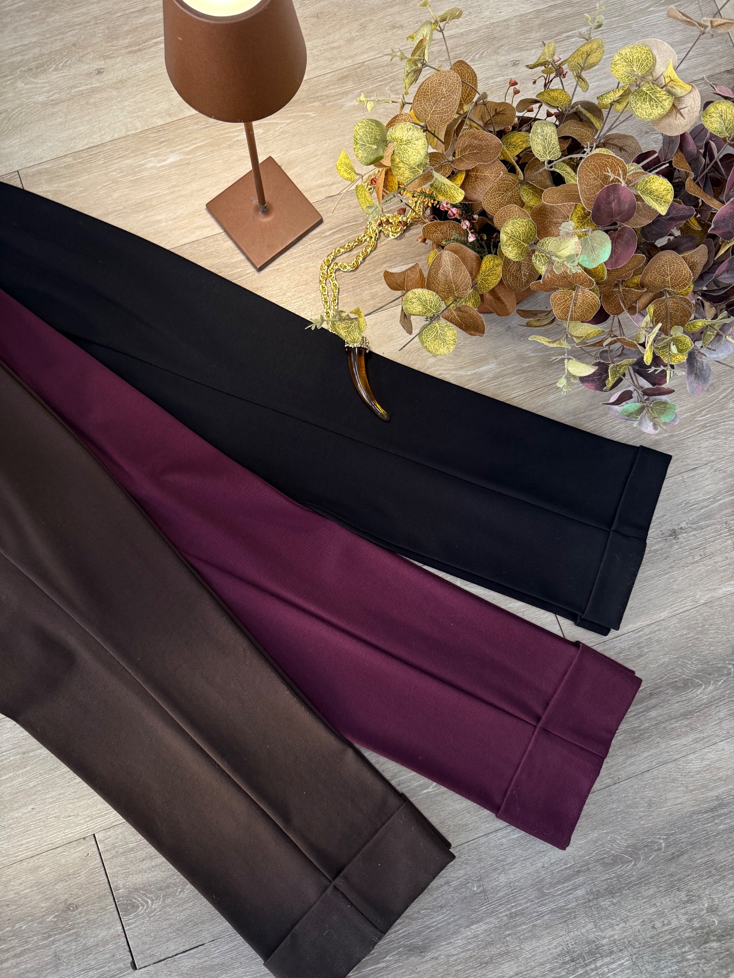 Pantalone elasticizzato in vita, senza tasche, taglio alla caviglia con risvolto in punto milano